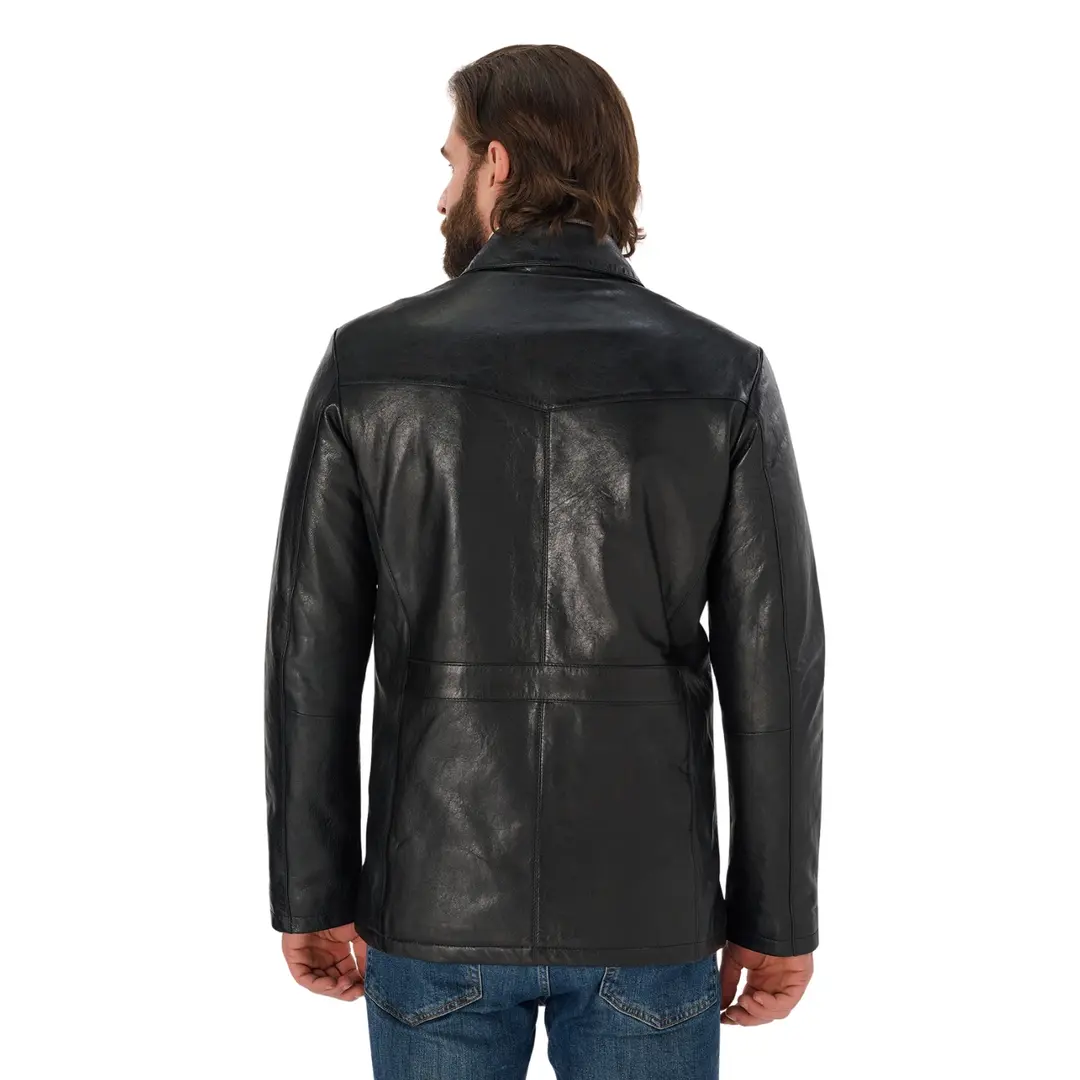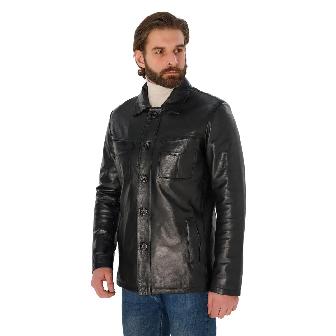 Designed with both fashion and functionality in mind, the soft viscose lining ensures breathable comfort for all-day wear, while the high-quality leather ensures long-lasting durability. The model is 184 cm tall and wears a Large size, showcasing the flattering and tailored fit for men of all shapes and sizes. Whether worn with jeans, trousers, or layered over sweaters, this black leather jacket is the perfect combination of classic fashion, modern comfort, and timeless style, making it an absolute essential for every man looking for a fashionable and long-lasting leather jacket.