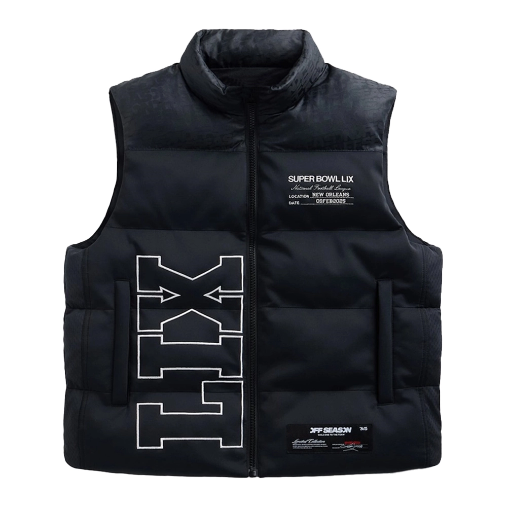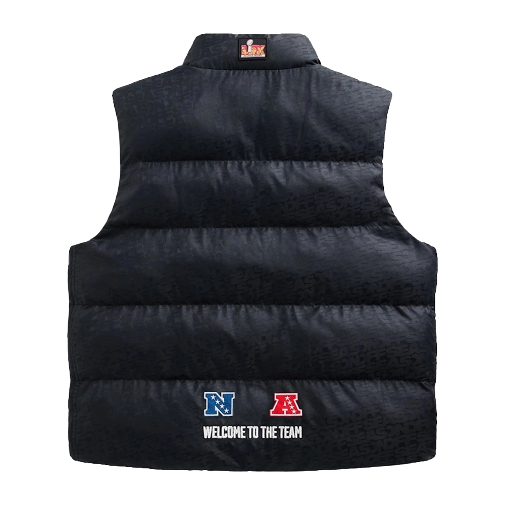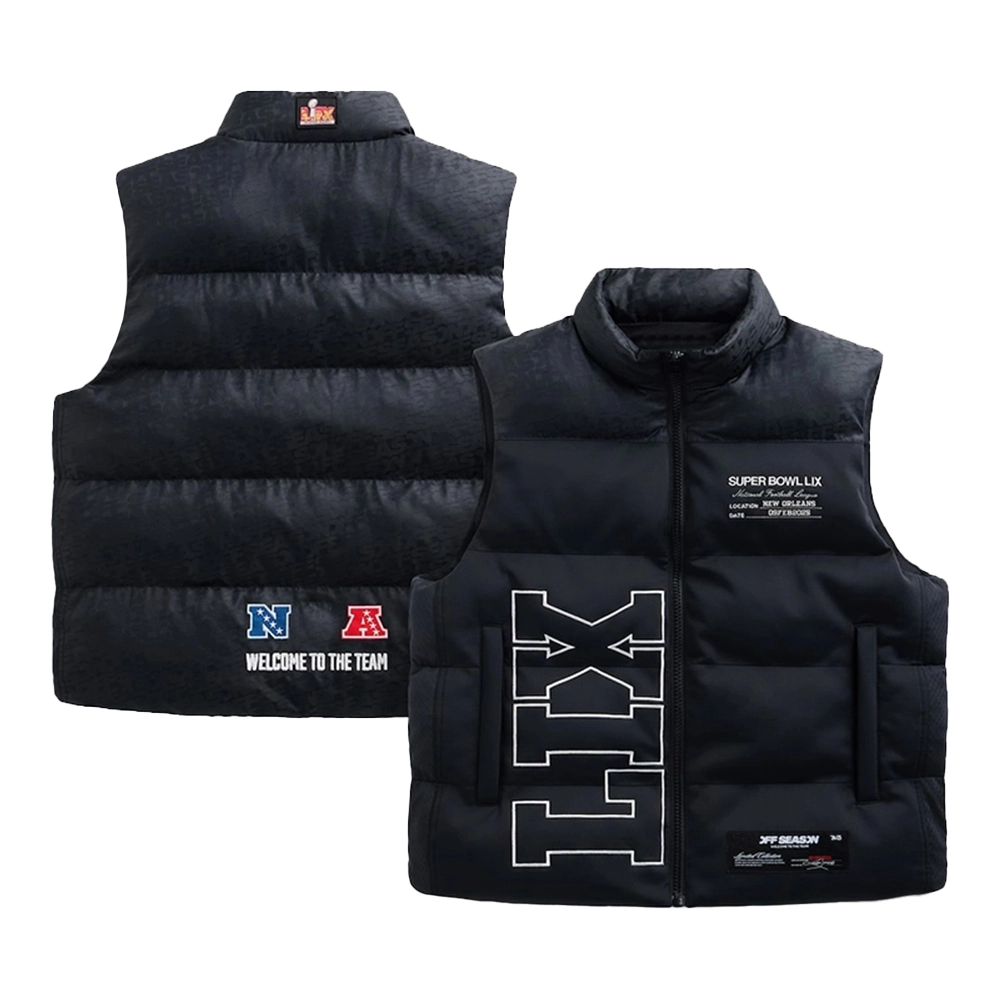 The design is modern and versatile, featuring a sleeveless cut that complements active lifestyles. A full front zipper closure provides convenience and secure wear. Side pockets add practicality, offering space to keep hands warm or store essentials. The vest’s fit is tailored to create a flattering silhouette while remaining roomy enough for layering over jerseys, hoodies, or sweatshirts. Distinctive Super Bowl LIX branding is displayed with precision, showcasing logos and design elements that mark the significance of the event. The bold graphics and clean embroidery make it instantly recognizable as official fan apparel. The neutral yet sporty color scheme ensures it pairs easily with different outfits, from game-day gear to casual streetwear.
